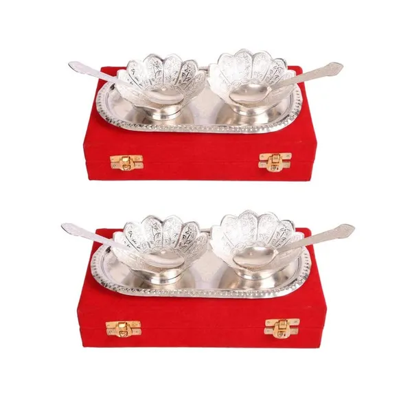 German Silver Plated Bowl with Tray Set Includes -1 Tray, 2 Bowls (150 ml), 2 Spoons (Pack of 2)
