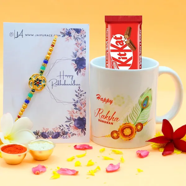 Celebrate the joyous occasion of Raksha Bandhan with the delightful JAIPUR ACE Kid Rakhi, Kitkat, and Ceramic Coffee Mug Combo Pack! This Rakhi gift hamper is the perfect way to express your love and affection for your little sibling. The highlight of this combo pack is the adorable Kid Rakhi specially designed to bring a smile to your sibling's face. With vibrant colors and intricate detailing, this Rakhi will make your bond even more special and unforgettable. Indulge your sibling's sweet tooth with the delicious Kitkat chocolates included in the combo. These mouthwatering treats will add a touch of sweetness to your celebrations and make the day even more enjoyable. To make the Rakhi festivities more memorable, this combo pack also features a stylish Ceramic Coffee Mug. Whether your sibling is a coffee lover or prefers hot cocoa, this mug is a thoughtful and practical gift that they can cherish and use for a long time. To complete the Raksha Bandhan ritual, the combo pack comes with a Tilak Set containing Kumkum. This traditional accessory adds a touch of authenticity to the celebrations and symbolizes the eternal bond between siblings. Show your love and care for your sibling with this all-inclusive Rakhi gift hamper. Make Raksha Bandhan a truly special occasion with the JAIPUR ACE Kid Rakhi, Kitkat, and Ceramic Coffee Mug Combo Pack - a perfect expression of affection and a memorable token of love for your beloved brother or sister.