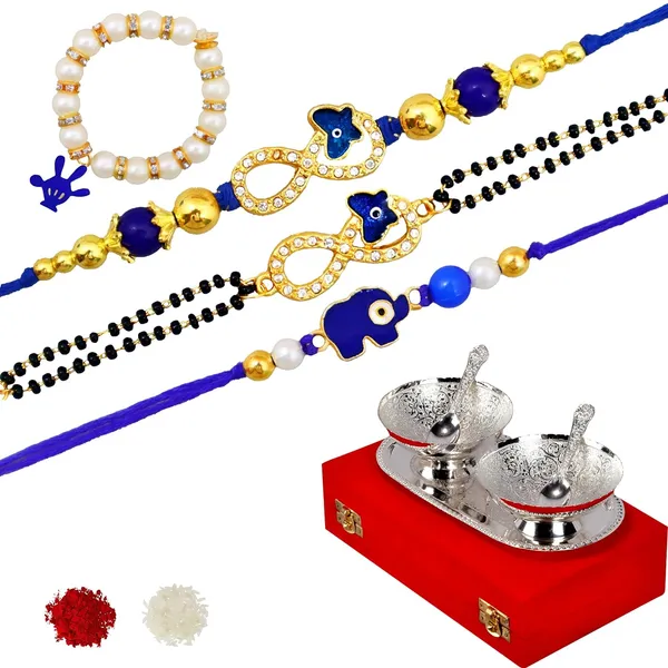 Premium Rakhi Gifts For Brother And Bhabhi With Gifts | Kundan And pearl Rakhi | Bhaiya Bhabhi Rakhi Family Combo Gift Silver Plated Bowl Set For Unisex Adult
