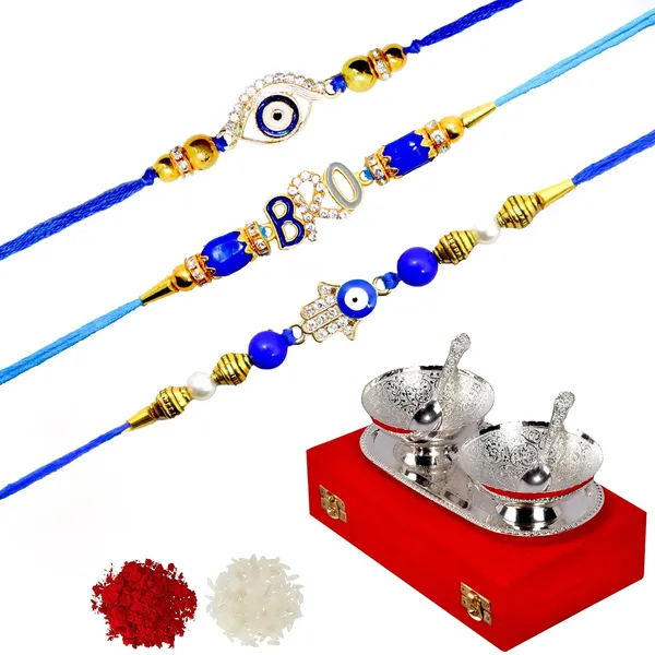 Premium Rakhi Gift for Brother | Evil Eye Rakhi With Gift Silver Plated Bowl Set | Evil Eye Rakhi With for Bro, Brother, Bhaiya, Bhai (3 Rakhi With Double Bowl)